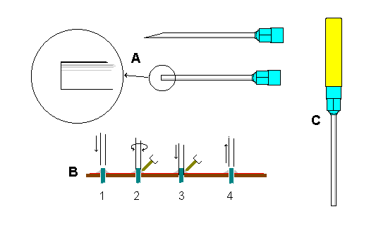 Para construirla, debemos cortar en forma perpendicular la punta de la aguja, como se aprecia en A, eliminando todas las rebarbas o asperezas internas y externas que pudieran quedar después del corte.