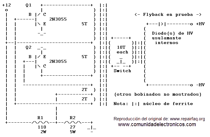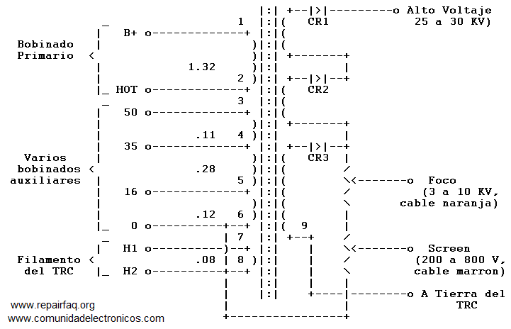 Este diagrama muestra un flyback típico que puede encontrarse un televisor color de visión directa o monitor de computadora. ¡La resistencia sólo es incluida con propósitos ilustrativos y pueden ser bastante diferente en su flyback!