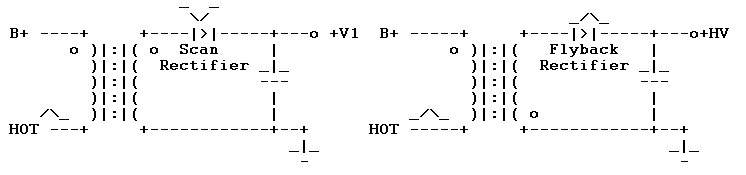 Un rectificador que convierte los pulsos de Alto Voltaje en corriente continua que luego el condensador formado en el TRC, filtra o aplana. El Alto Voltaje puede desarrollarse directamente en un solo bobinado con muchas espiras de alambre, o un bobinado que genera un voltaje más bajo y un multiplicador de voltaje de diodo-condensador.