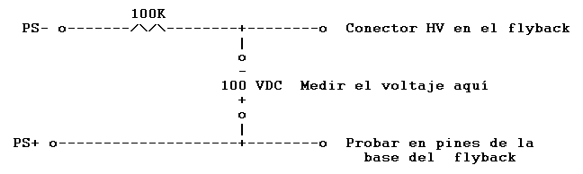 Pruebe cada pin de la base del flyback. Al tocar el pin de retorno de se producirá una caída del voltaje leído que puede alcanzar los 50 o 60 voltios. Ésta es la caída en los rectificadores de alto voltaje alto dentro del flyback. En todos los otros pines la lectura indicara el voltaje de la fuente. Nota: que si usted no puede localizar el retorno de HV, el flyback pueden estar defectuoso; puede tener una mala conexión interna, un rectificador de HV abierto, o quemado el bobinado de HV.