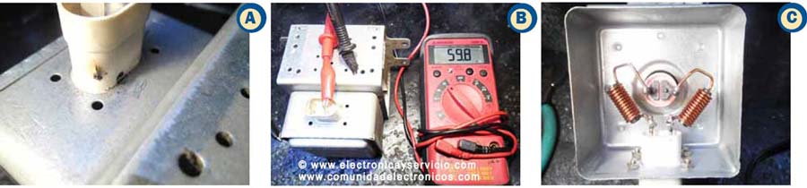 En el conector de los filamentos del magnetrón, existe un filtro encapsulado por cerámica. En el caso que estamos describiendo, este filtro se puso en corto. Muchas veces, esto se aprecia a simple vista (figura 2A). Pero como en otras ocasiones no se ve el daño, hay que medir la continuidad entre el filamento y el cuerpo del magnetrón o tierra; cuando el filtro está realmente en corto, el multímetro marca una resistencia baja (figura 2B); y cuando el filtro se encuentra en buen estado, el multímetro marca "infinito".