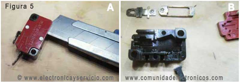 1. Extraiga los interruptores de su lugar; y para que pueda desarmarlos, introduzca el filo de una navaja por la parte en donde se unen sus secciones (figura 5A).