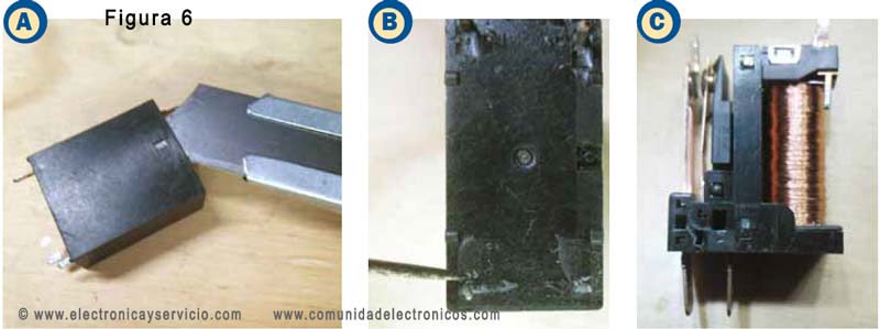 4. Una vez desarmado el relevador, quedarán al descubierto sus contactos (figura 6C); se pueden retirar, si se trabaja con cuidado; revíselos y si están carbonizados (como casi siempre sucede), púlalos o límpielos con una lija de agua de grano fino; proceda con mucho cuidado.