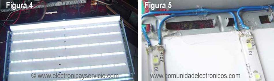 En las pantallas que tienen iluminación trasera, por cada lámpara retirada se debe colocar un tramo de la tira de diodos (figura 4). Y en las pantallas con iluminación lateral, superior o inferior, se coloca un tramo (o dos tramos) en cada lado de la pantalla.