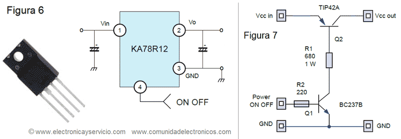 Podemos usar reguladores switcheados, los cuales, por medio de la orden de POWER, controlan al voltaje de salida (figura 6). Sin embargo, a veces es difícil conseguir estos circuitos; sobre todo circuitos que sirven para controlar la alimentación de 24 VCD.