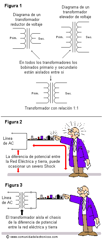 Al colocar un transformador aislador, entre la red eléctrica y el aparato o circuito que se esté manipulando, este recibirá el mismo voltaje requerido para su funcionamiento pero estará aislado de la diferencia de potencial existente entre la línea de distribución eléctrica y tierra, evitando de esa manera, el peligro de sufrir una descarga al entrar en contacto con el. Ver figura 3.