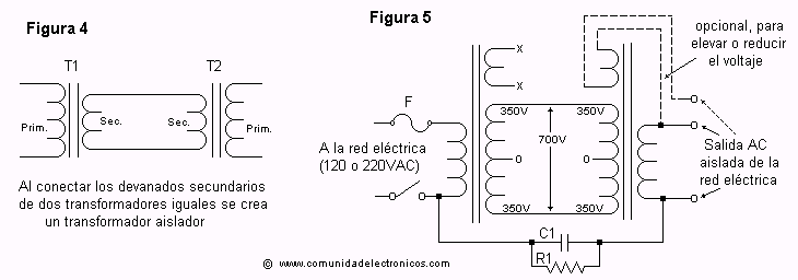 Usando dos transformadores iguales o de características muy similares (sobre todo el voltaje de sus bobinados), se puede implementar un transformador aislador, simplemente conectando ente si, los bobinados secundarios de ambos (ver figura 4). De ese modo, al aplicar el voltaje de la red eléctrica al bobinado primario de uno de ellos (T1) se obtiene un voltaje similar en el primario del otro (T2), que en este caso actúa como secundario.